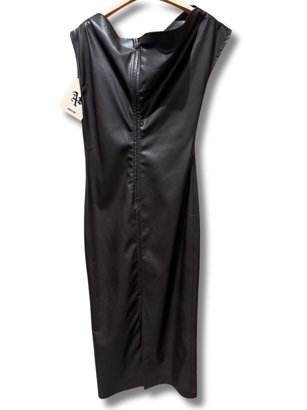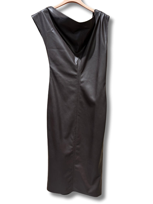 Tubino midi in ecopelle moka, stretch, con spalla scesa e scollo a gronda, con sottoveste e chiusura posteriore con zip.