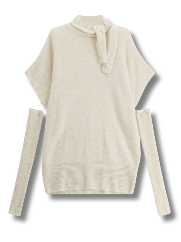 Abito corto in maglia panna, manica corta con manicotti, fiocco al collo.