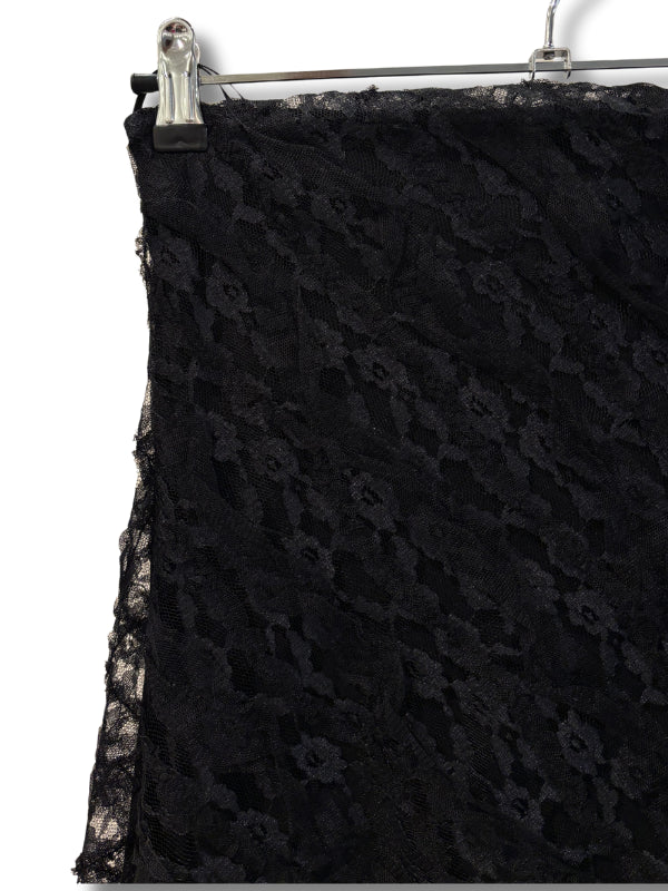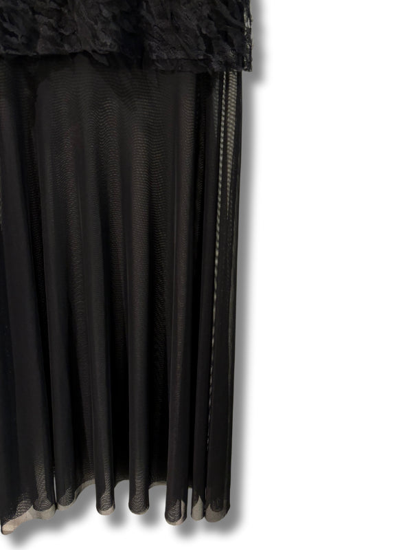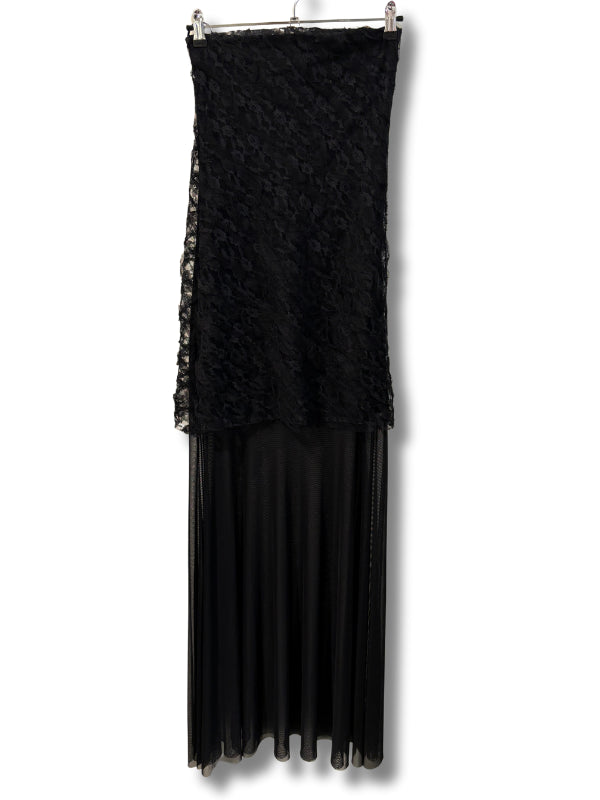 Abito lungo a fascia in pizzo e tulle nero.