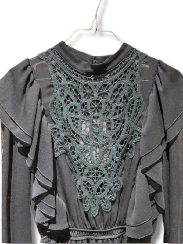 Abito corto nero, manica lunga con polsini a campana, coletto alla coreana, pettorina ricamata in macramè, con rouches.
