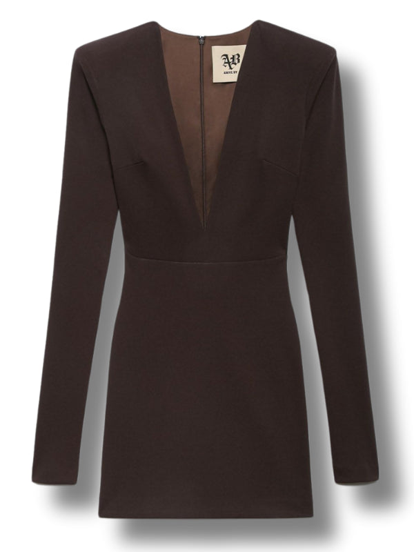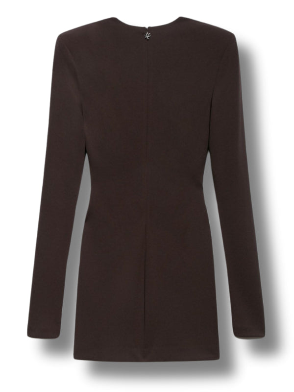 Abito corto Sienna in tessuto stretch moka, scollo a V, maniche lunghe, fodera interna.