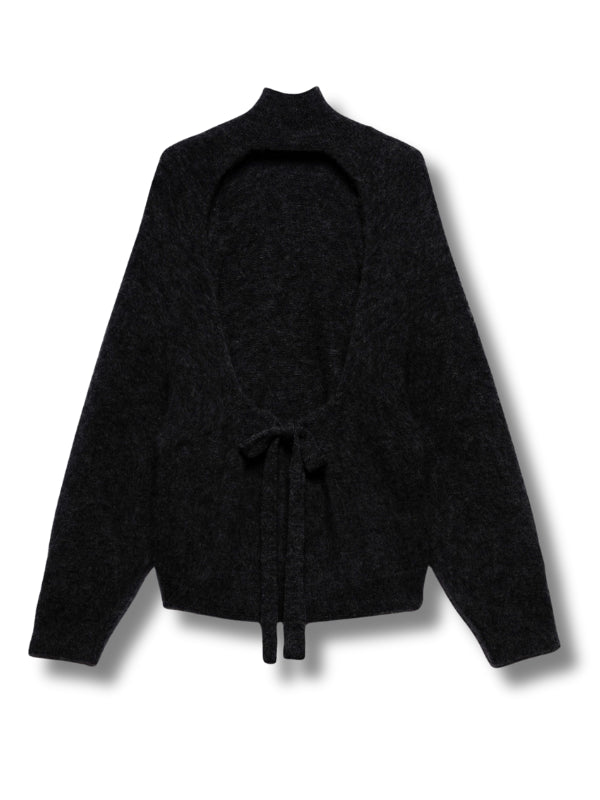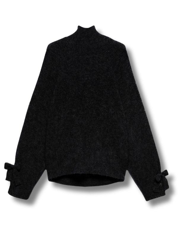 Dolcevita Holly in maglia di misto lana e alpaca stretch, maniche lunghe raglan, polsi con fiocchetti, oblò con fiocco sul retro, bordi a costine.