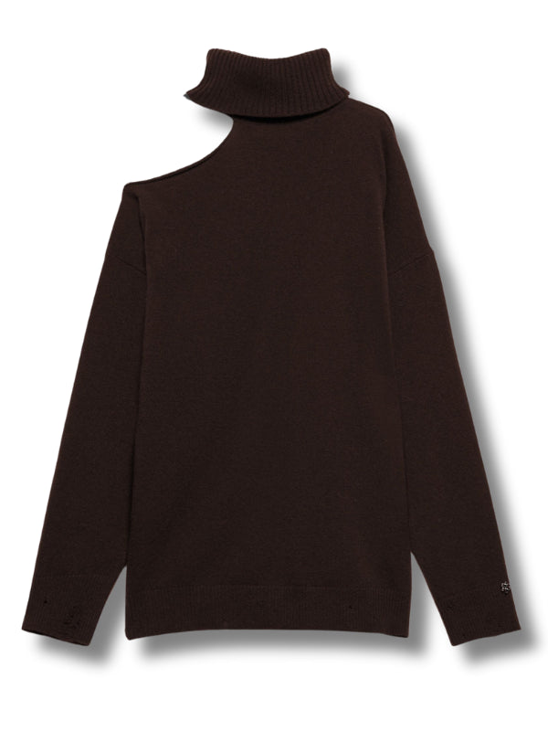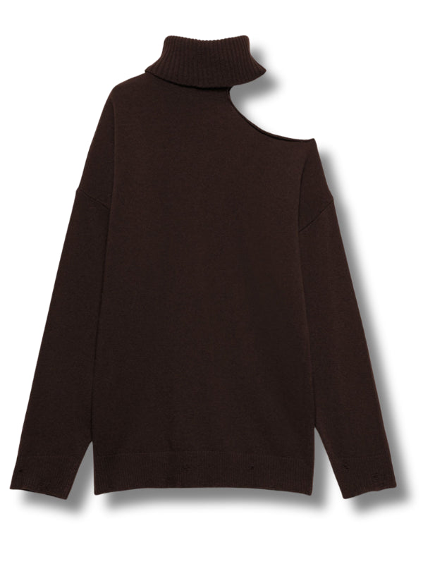 Dolcevita Vivien in maglia di lana, motivo cut-out sulla spalla, bordi a costine con dettagli destroyed.