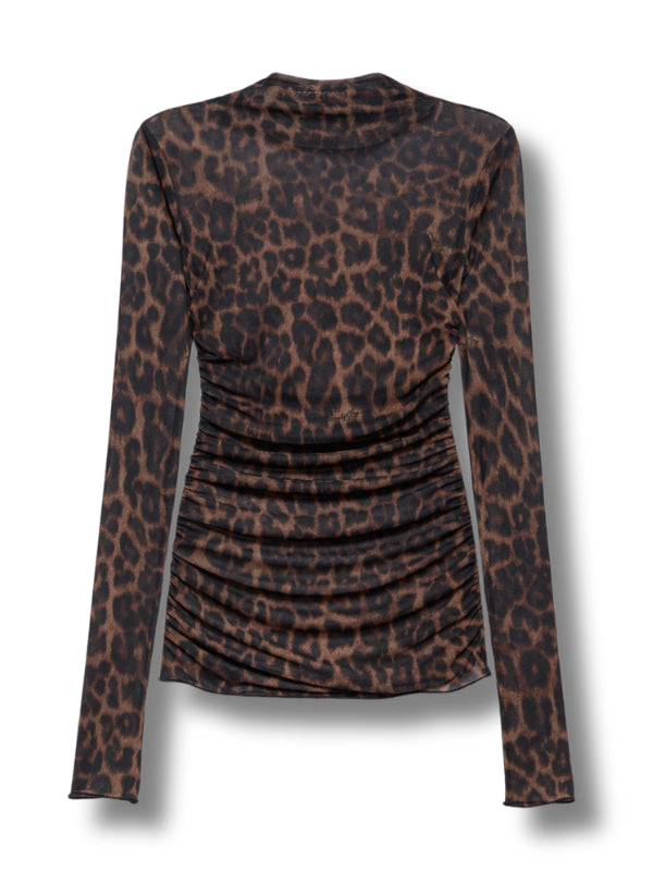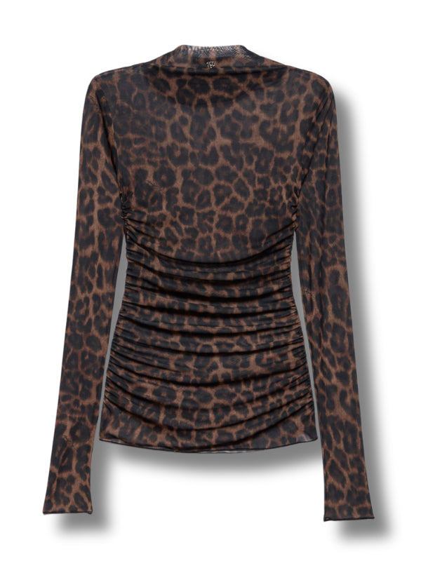 Top Judy in tessuto stretch, stampa animalier all over, motivo drappeggiato, collo alto e maniche lunghe.