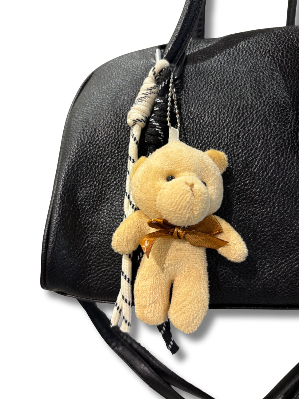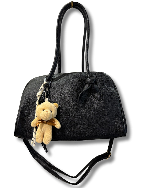 Borsa modello bowling in ecopelle, con tracolla e charms applicati.