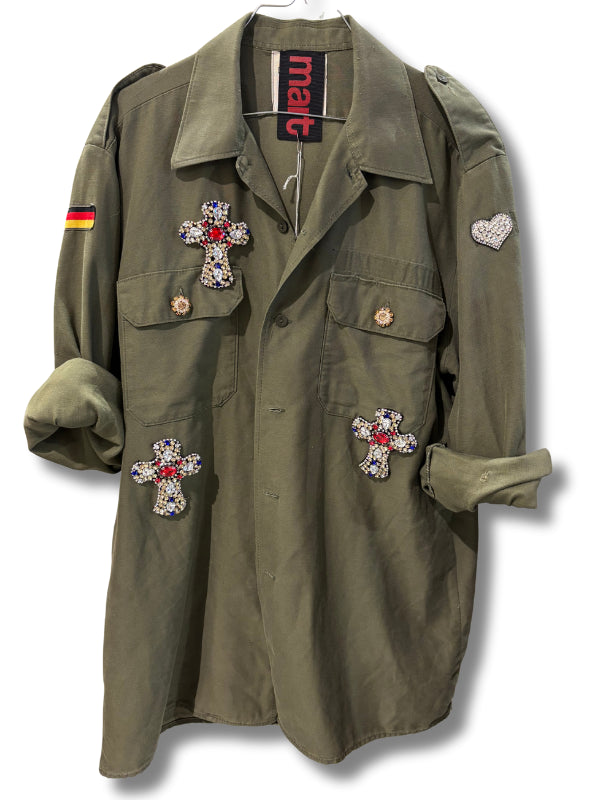 Sahariana militare, modello originale vintage, con applicazioni in strass. Taglia unica, pezzo unico, contattaci su Whatsapp o sui social per maggiori info. Ogni capo della vintage selection ILOVEMART è un pezzo unico rifinito artigianalmente.