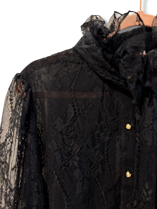 Camicia nera in pizzo con colletto alla coreana e sciarpino.