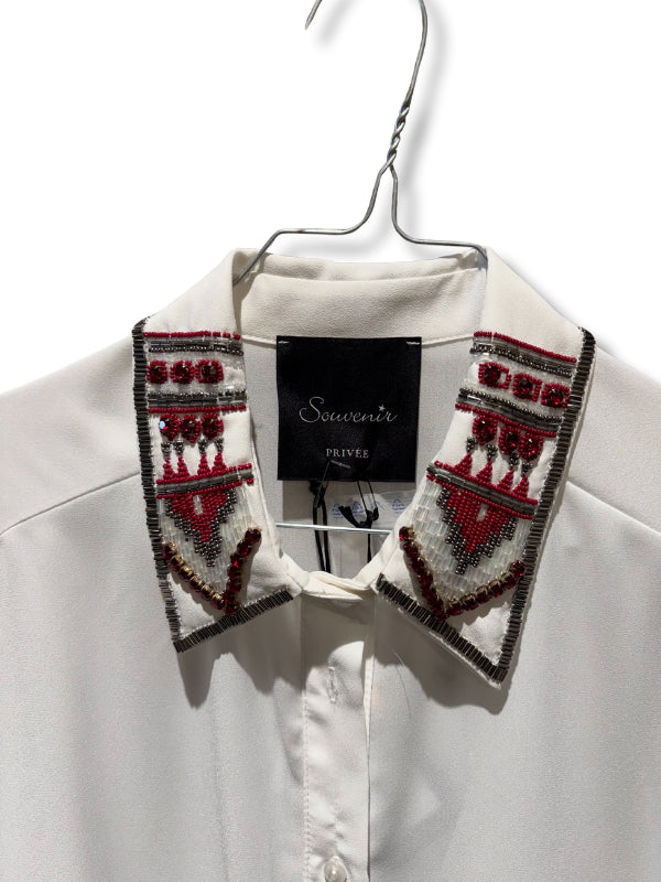Camicia bianca con colletto ricamato con pietre, manica lunga con polsino a campana plissè.
