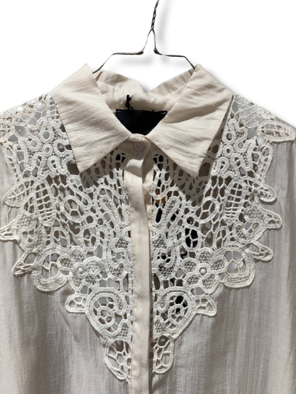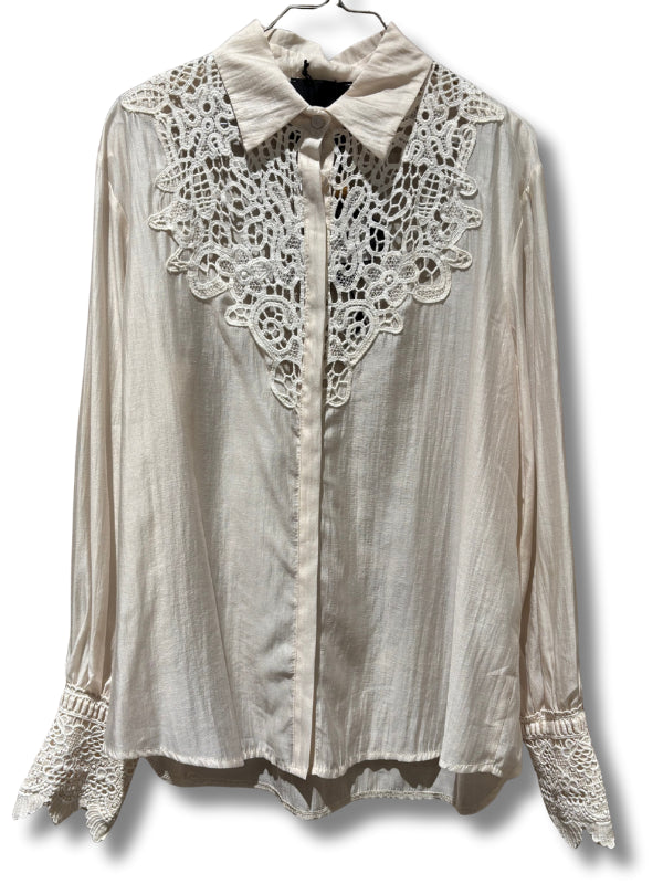 Camicetta in lyocel latte con inserto in pizzo macramè sul davanti, coletto classico, manica lunga con polsino ricamato.