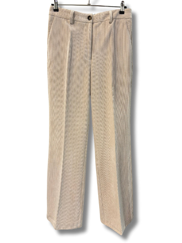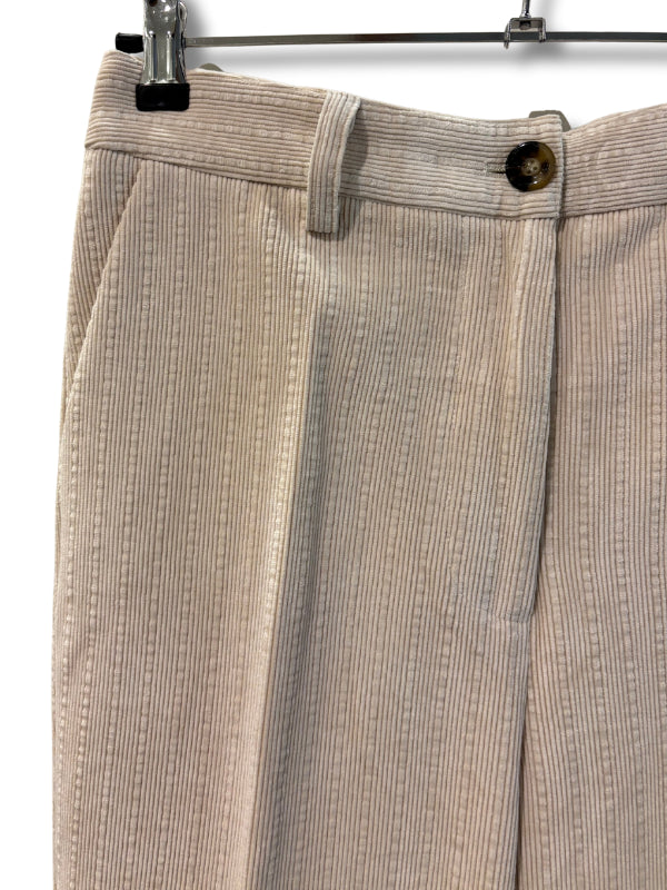 Pantalone dritto in velluto a coste panna, modello a vita alta con piega.