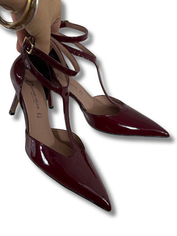 Decolletè in vernice amarena, modello tanghera con doppio laccino, tacco 7 cm. Disponibile in più colori.