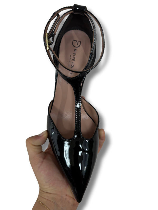 Decolletè in vernice nera, modello tanghera con doppio laccino, tacco 7 cm. Disponibile in più colori.