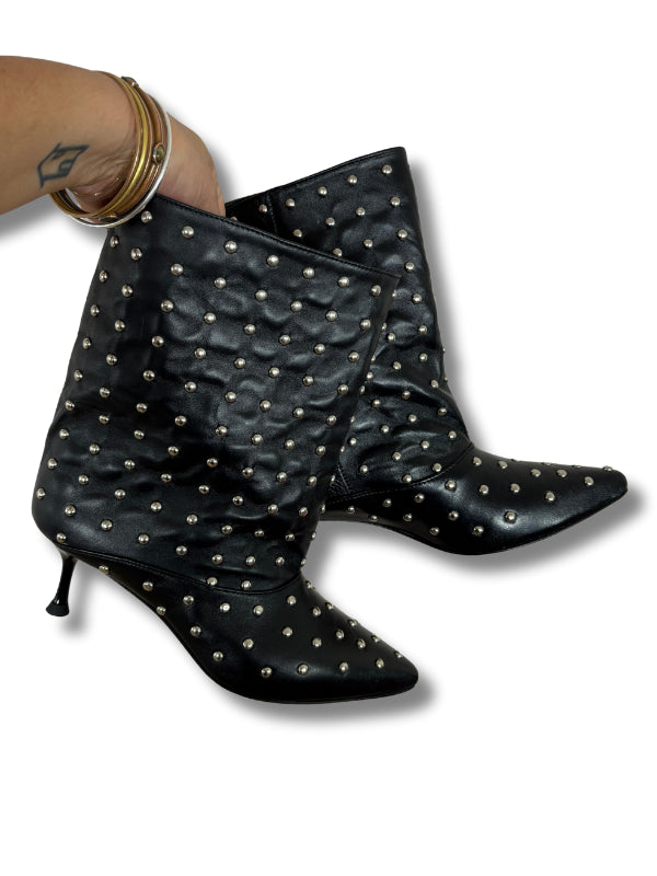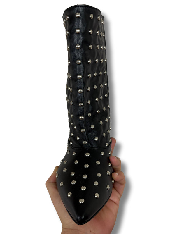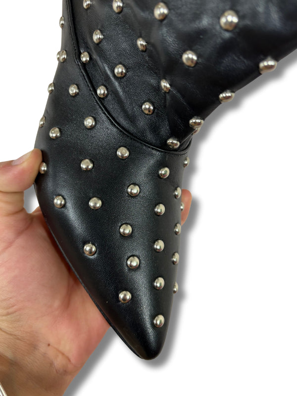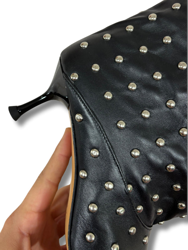 Stivaletto in nappa nera con borchie all over, gambale ampio, tacco fine 4 cm.