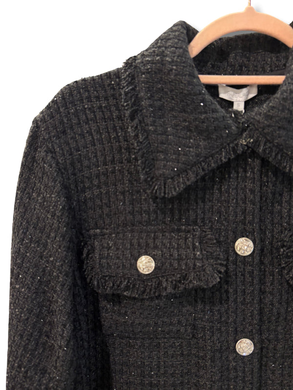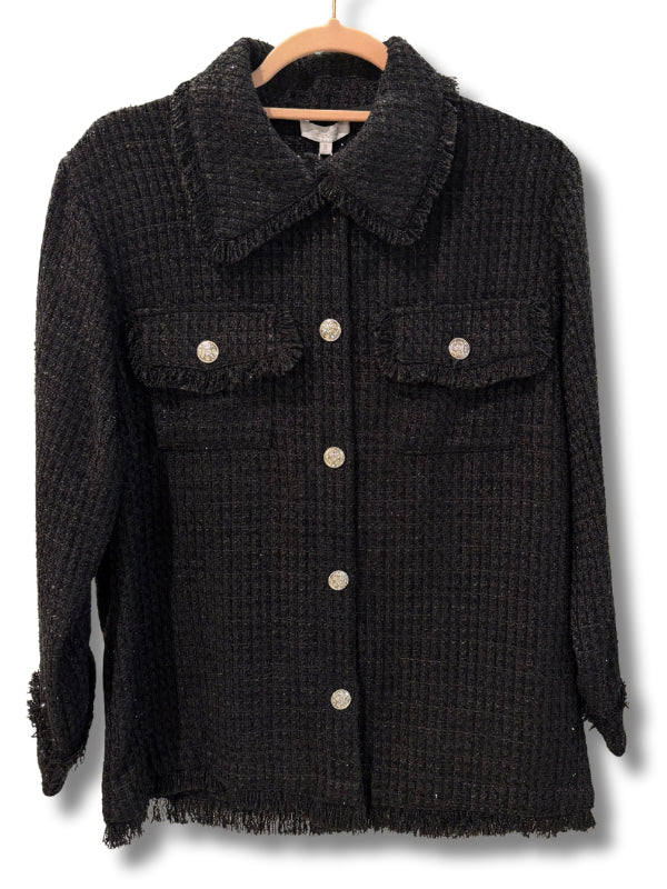 Giacca dritta tipo over shirt neri in tessuto bouclè con filo lurex.