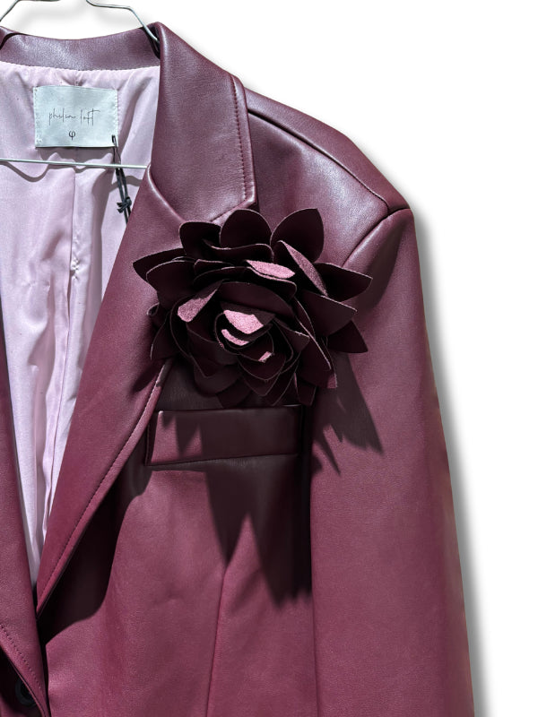 Blazer dritto in ecopelle bordeaux, monobottone con tasche a pattina, con accessorio spilla.