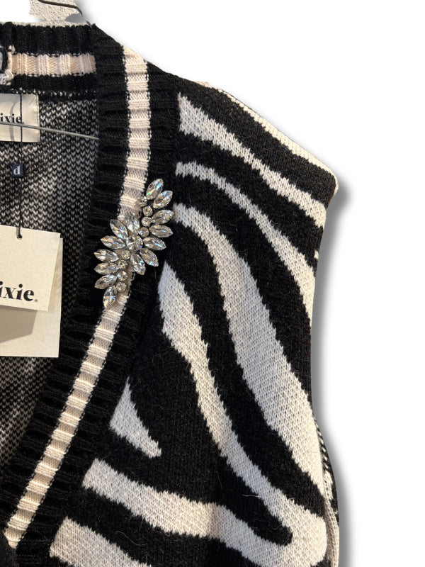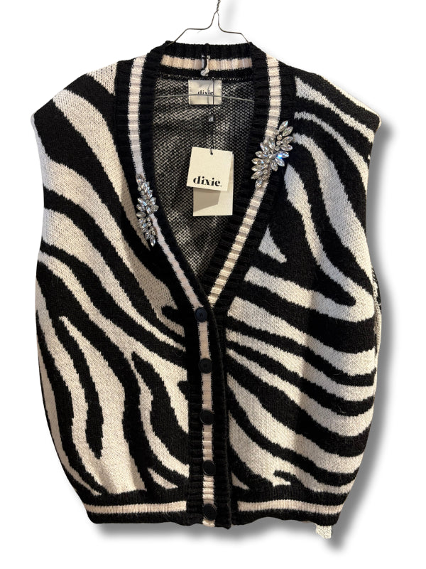 Gilet over in maglia zebrata bianca e nera con bottoni e strass applicati.