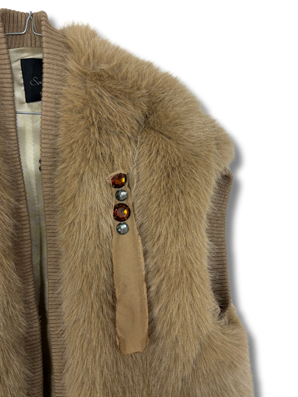 Gilet over in ecufur miele con decorazione applicata con pietre, foera interna e giromanica con bordatura in maglia.
