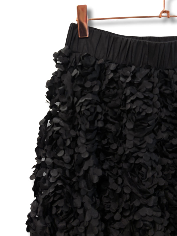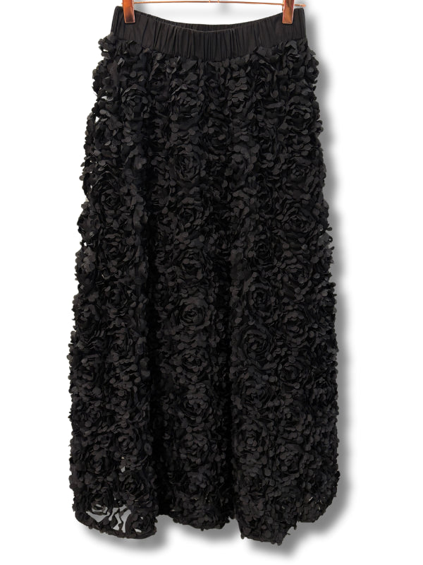 Gonna lunga svasata con rose in raso all over, elastico in vita.