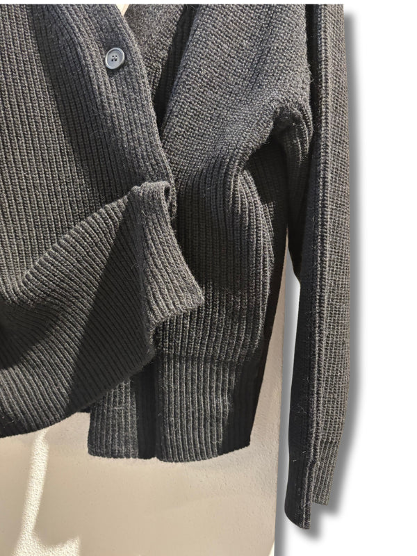 Cardigan in maglia a coste nera con abbottonatura asimmetrica.