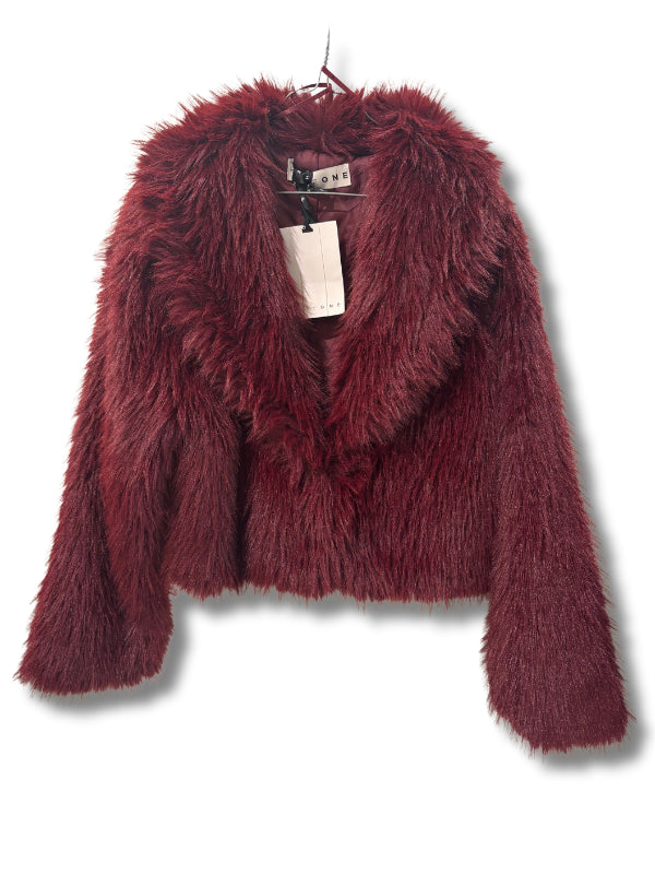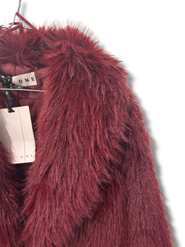 Giubbino in ecopelliccia bordeaux, modello corto con maxi colletto stondato.