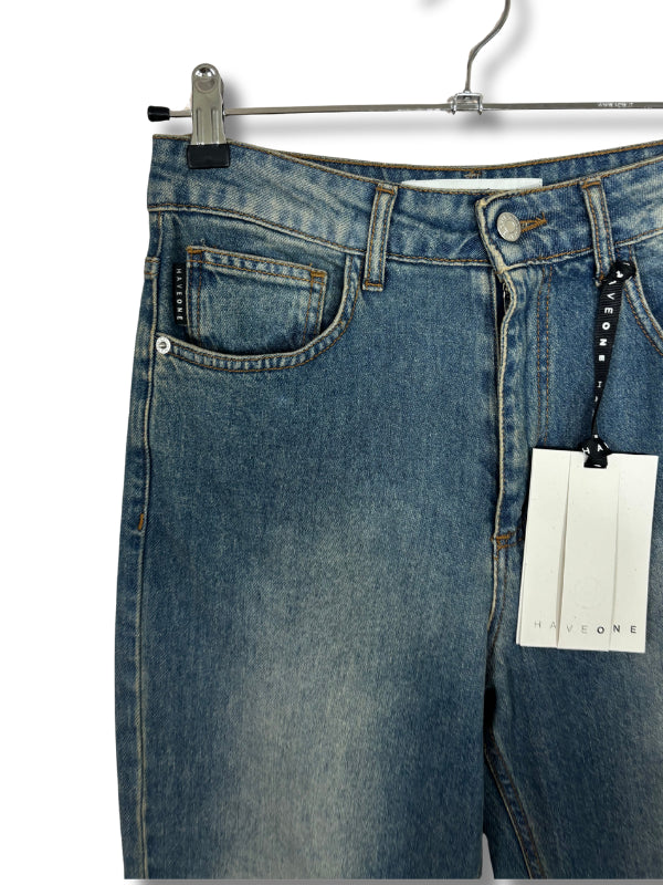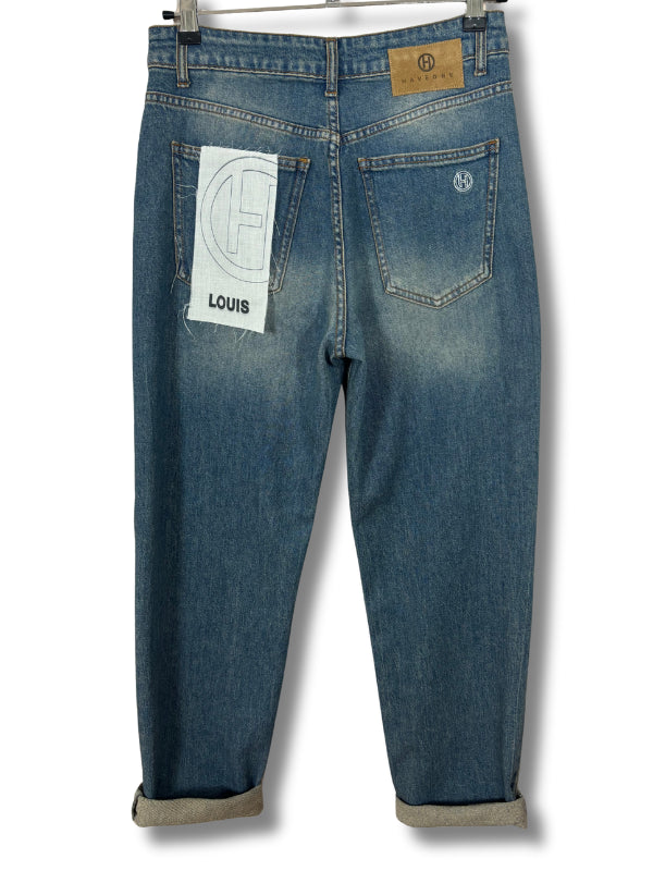 Jeans regular, lavaggio medio, più stretto al fondo.