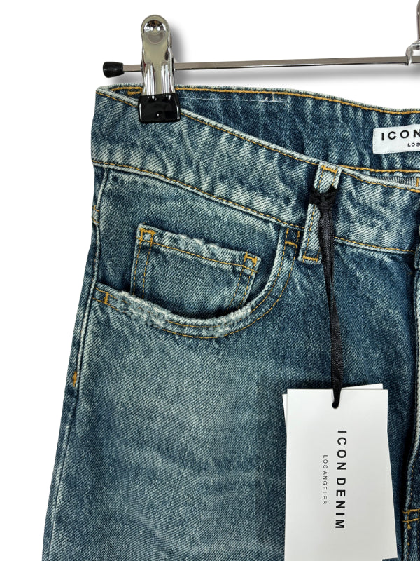 Jeans fermo, modello dritto, gamba slim, vita regolare, denim lavaggio medio.