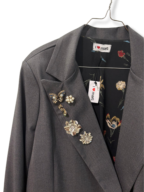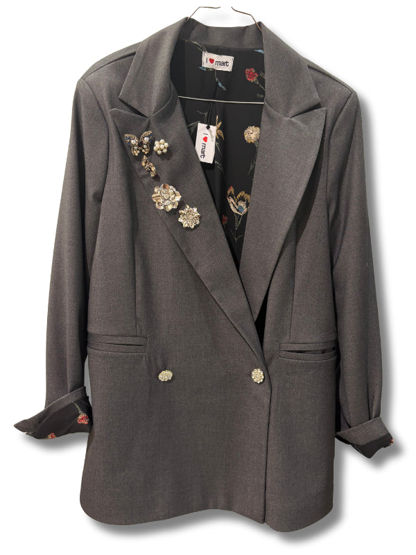 Giacca doppiopetto antracite con fodera a contrasto, con spille bottoni gioiello. Prodotto esclusivo della ILOVEMART collection.