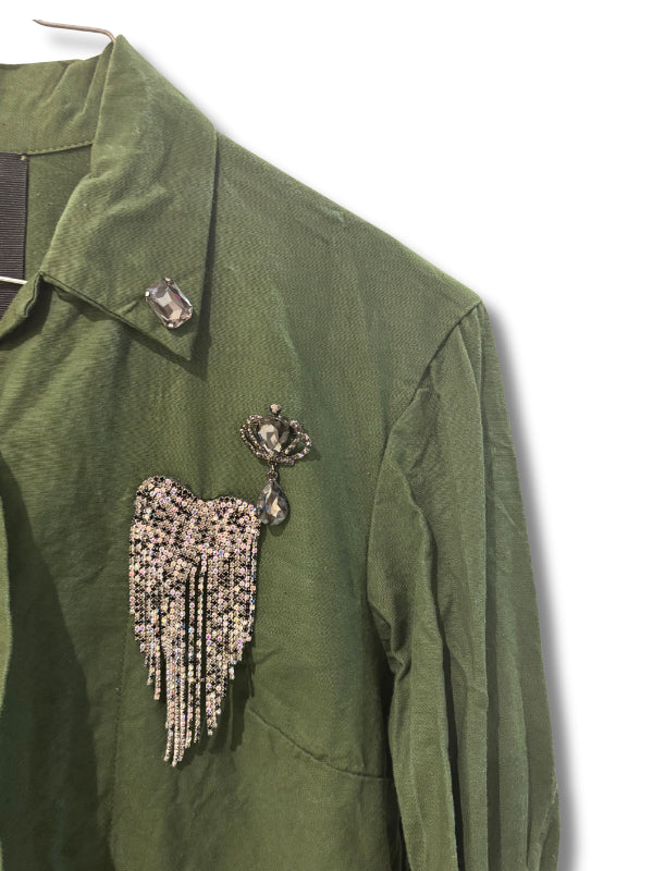 Camicia militare, modello originale vintage, con applicazioni in strass. Taglia unica, pezzo unico, vestibilità piccola, contattaci su Whatsapp o sui social per maggiori info. Ogni capo della vintage selection ILOVEMART è un pezzo unico rifinito artigianalmente.