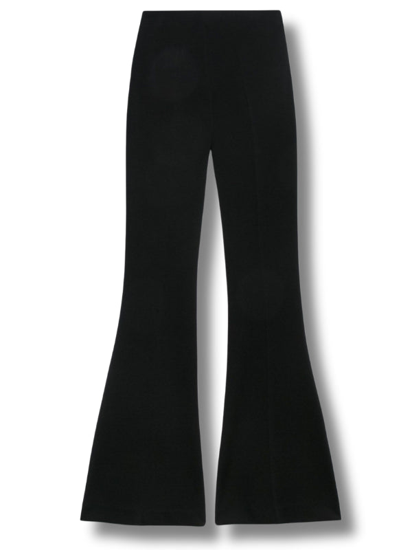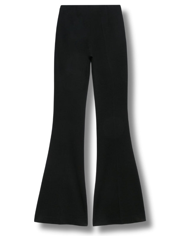 Pantaloni flare neri, modello Sienna, in tessuto stretch, piega stirata, tirazip logata e chiusura con zip sul fianco.