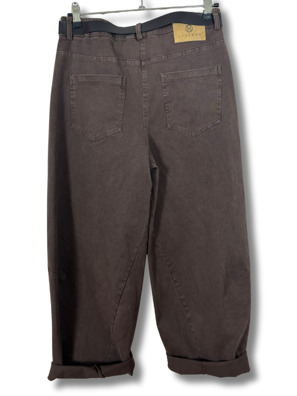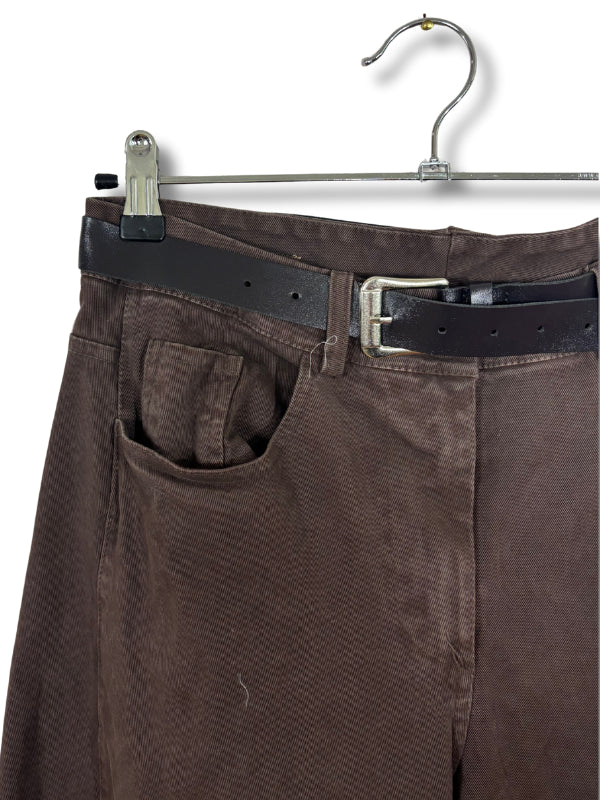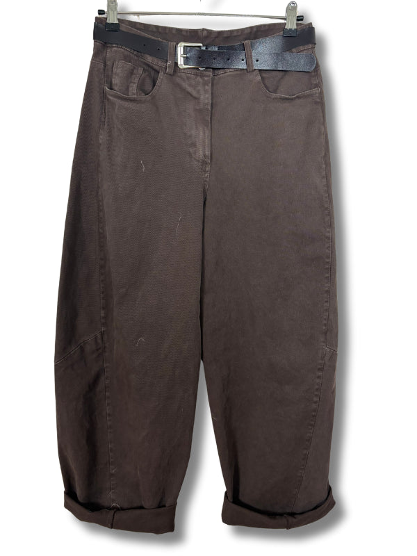 Pantalone in gabardina cioccolato, modello a ovetto, con cintura.