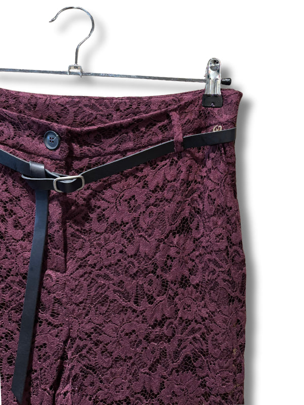 Pantalone flare in pizzo color vino con culotte e cinturino.
