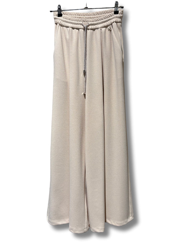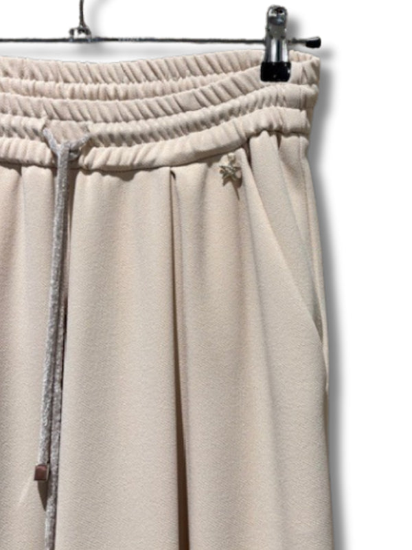 Pantalone palazzo tipo joggers in tessuto a maglia latte con elastico e coulisse.