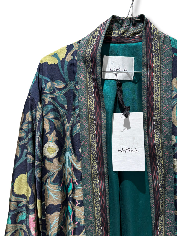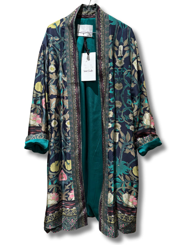 Kimono lungo fantasia multicolor in viscosa base blu con fodera in raso a contrasto, modello senza chiusure, collo sciallato, con tasche.