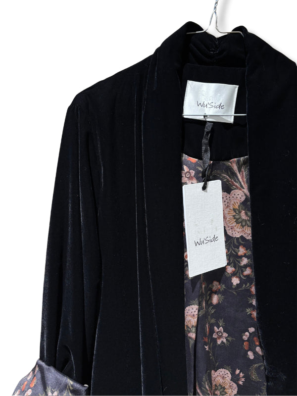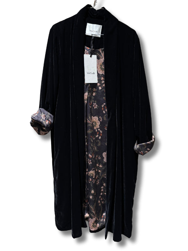 Kimono lungo in velluto liscio nero con fodera in viscosa fantasia, modello senza chiusure, collo sciallato, con tasche. Disponibile in più colori.