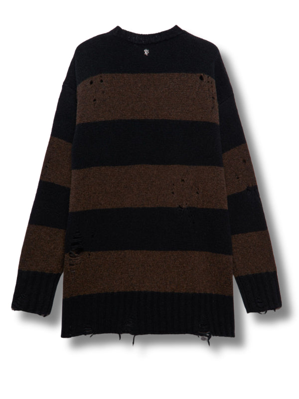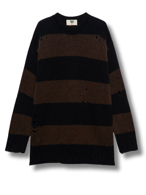 Maglione Aly in misto lana, motivo a righe cioccolato e nero, dettagli destroyed, girocollo con bordi a coste.