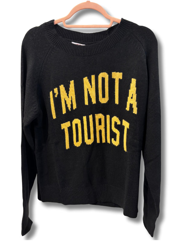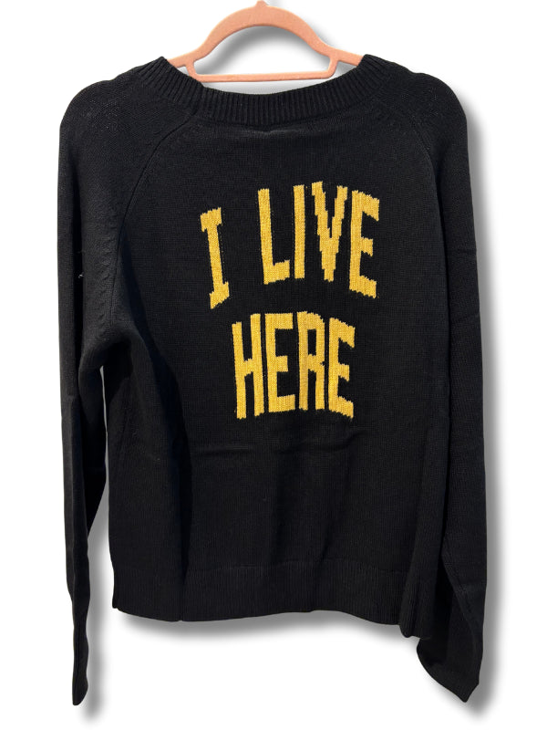 Maglia misto lana nera con lavorazione jaquard senape, paricollo, vestibilità regular.