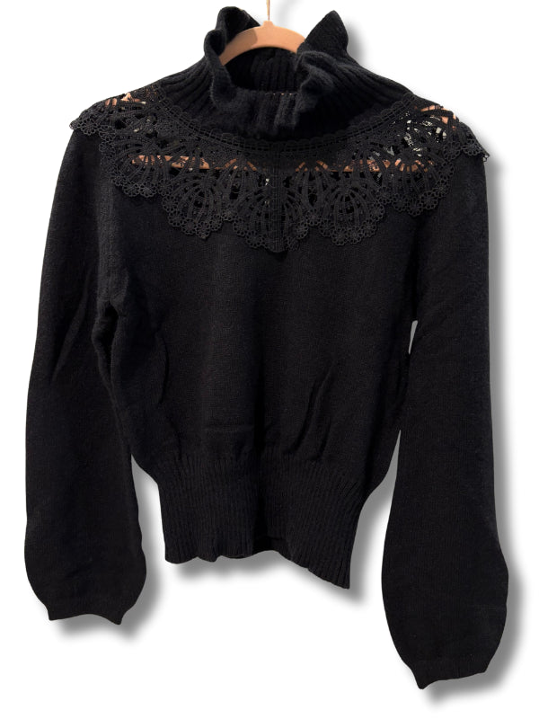 Maglia nera a collo alto con tramezzi in pizzo e manica lunga a palloncino.