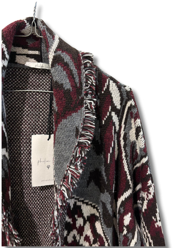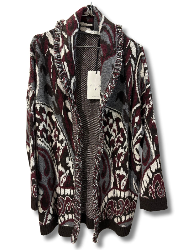 Cardigan midi lavorazione jaquard multicolor con frange e cintura.