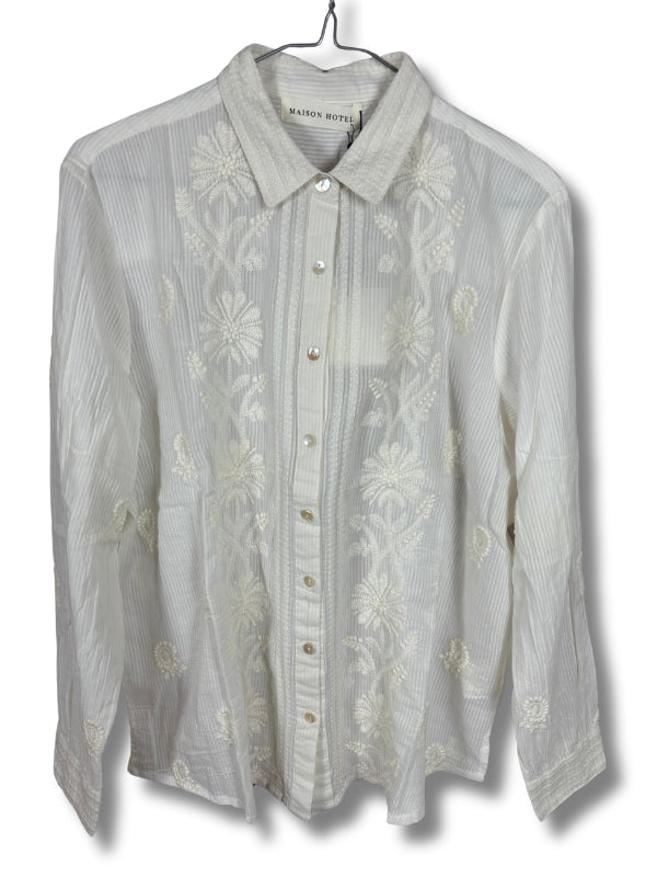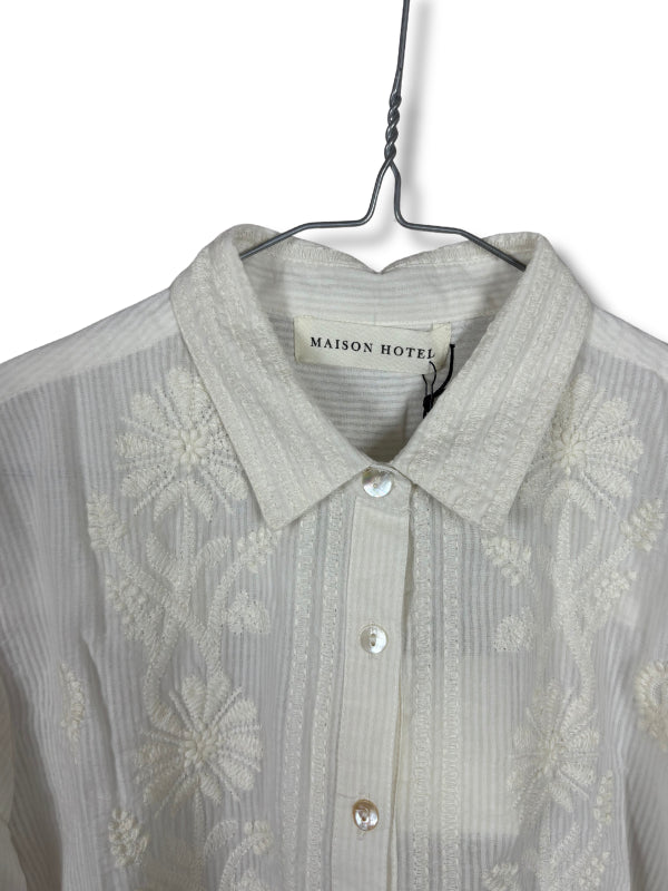 Camicia in mussola di cotone bianca con ricami sul davanti.