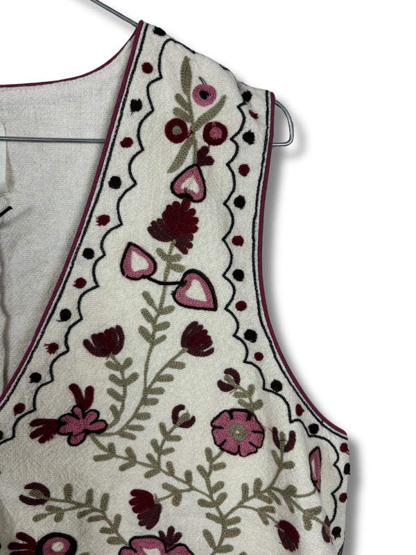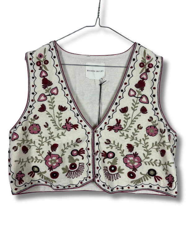 Gilet corto in cotone panna con ricami stile gispy multicolor, chiusura con gancini.