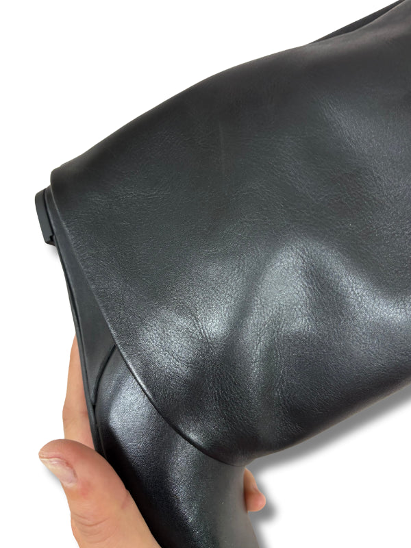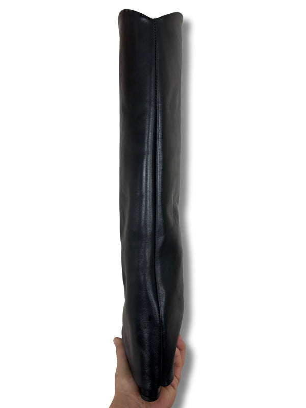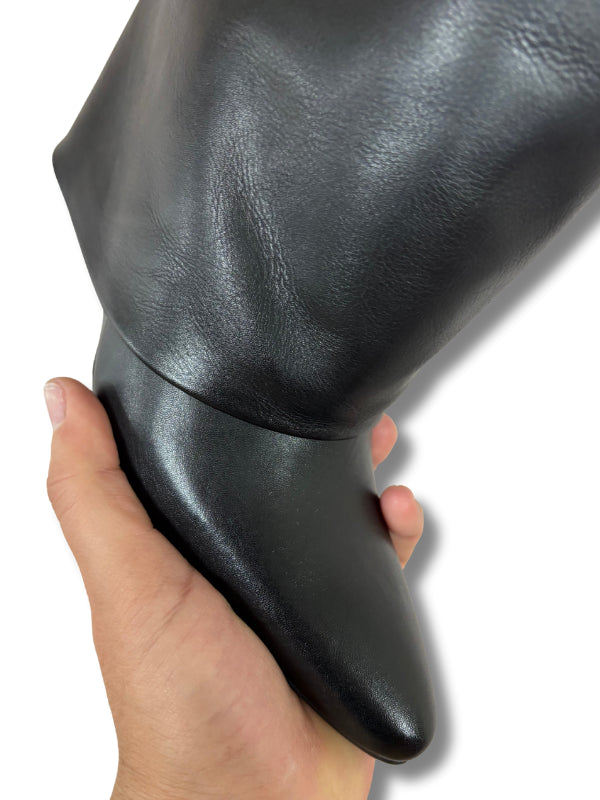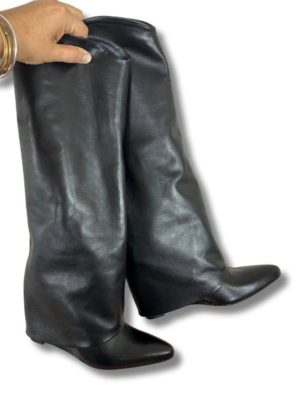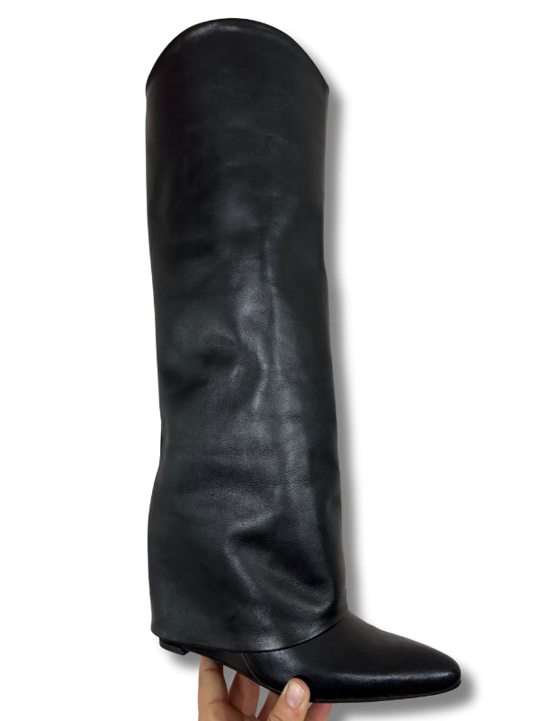 Stivale in nappa nera con zeppa e gambale ampio rovesciato.