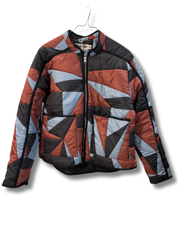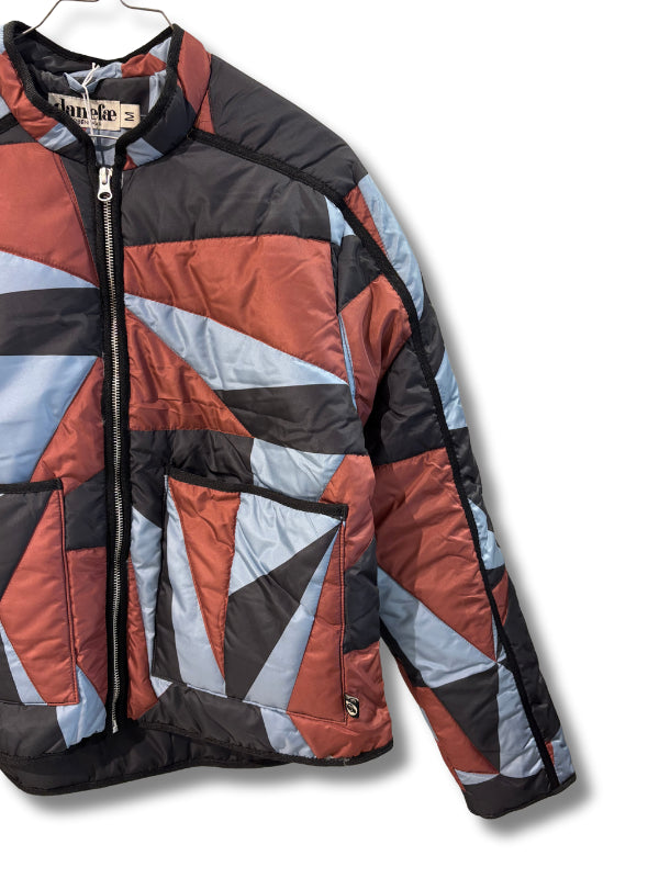 Giubbino imbotttito trapuntato fantasia geometrica multicolor, con cerniera.