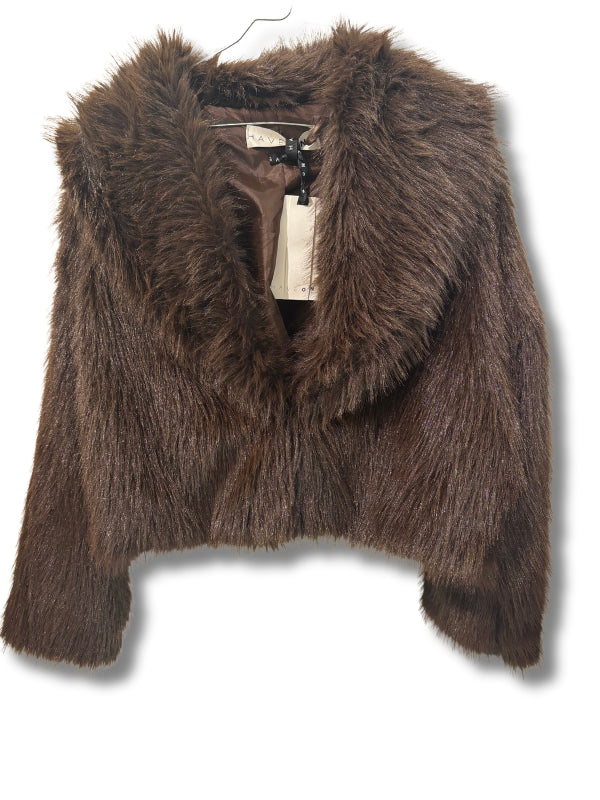 Giubbino in ecopelliccia cioccolato, modello corto con maxi colletto stondato.