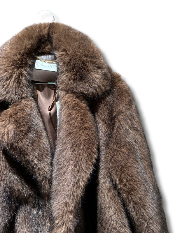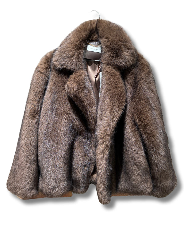 Ecopelliccia corta cioccolato, modello over con revers e foulard incluso.