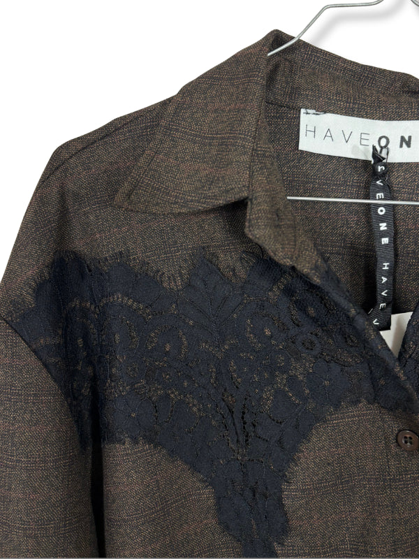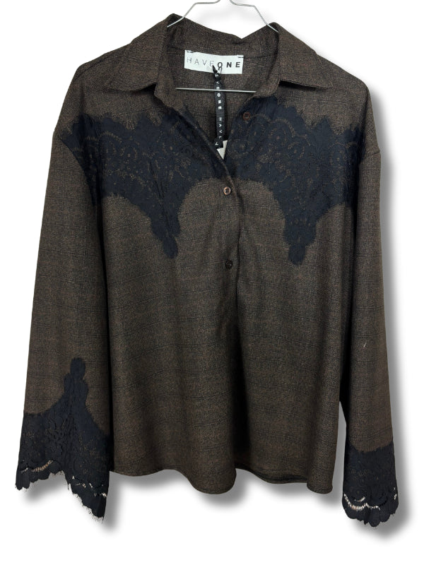 Camicia a quadri moro con inserti in pizzo, modello over a scatolina.