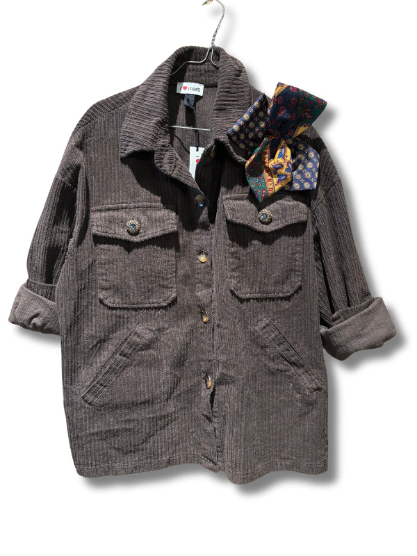 Overshirt in velluto a coste cioccolato con tasche applicate, bottoni gioiello e spilla vintage.
