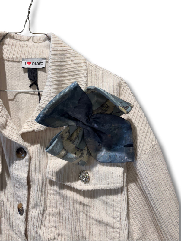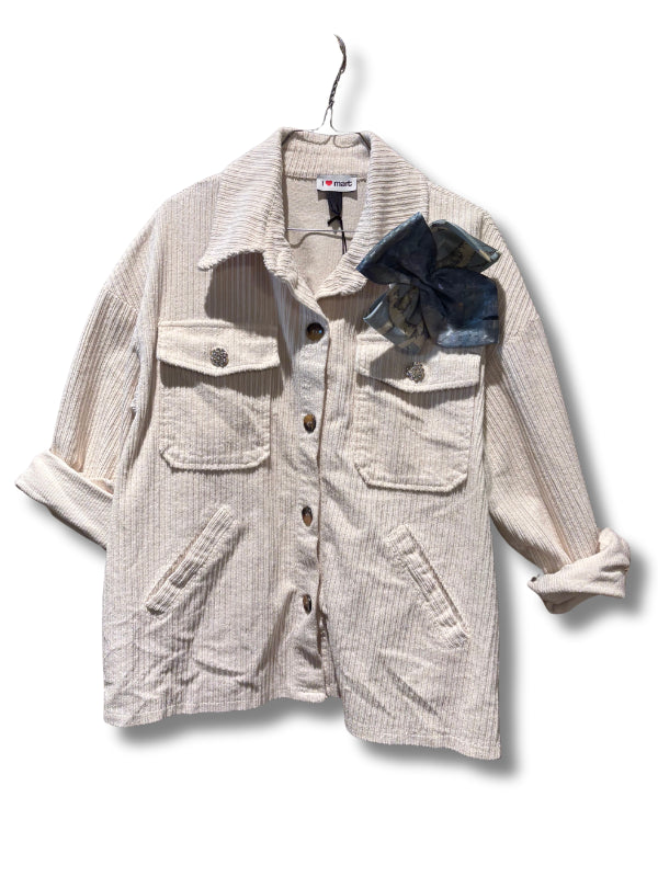 Overshirt in velluto a coste panna con tasche applicate, bottoni gioiello e spilla vintage.