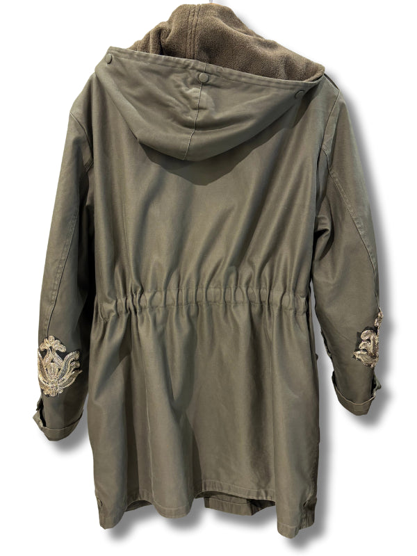 Parka militare vintage con fodera in eco fur rimuovibile e cappuccio, con applicazioni varie e bottoni gioiello. Taglia unica, pezzo unico, contattaci su Whatsapp o sui social per maggiori info. Ogni capo della vintage selection ILOVEMART è un pezzo unico rifinito artigianalmente.
