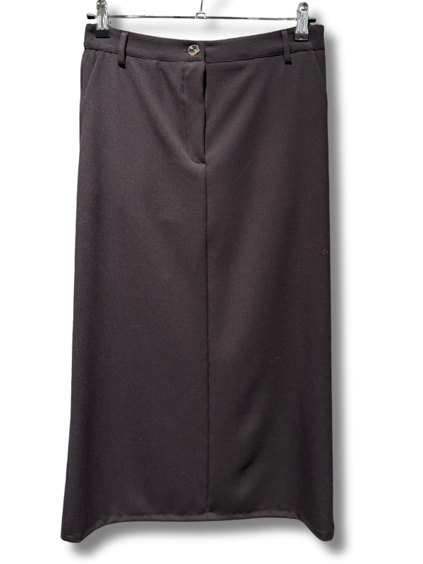 Gonna longuette moka, modello pencil con inserto plissè sul retro, con bottone e cerniera.