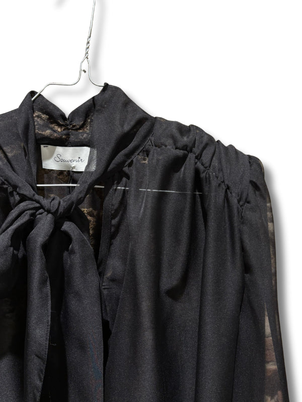 Camicia in voile nero con cloetto alla coreana con fiocco e spalline imbottite.